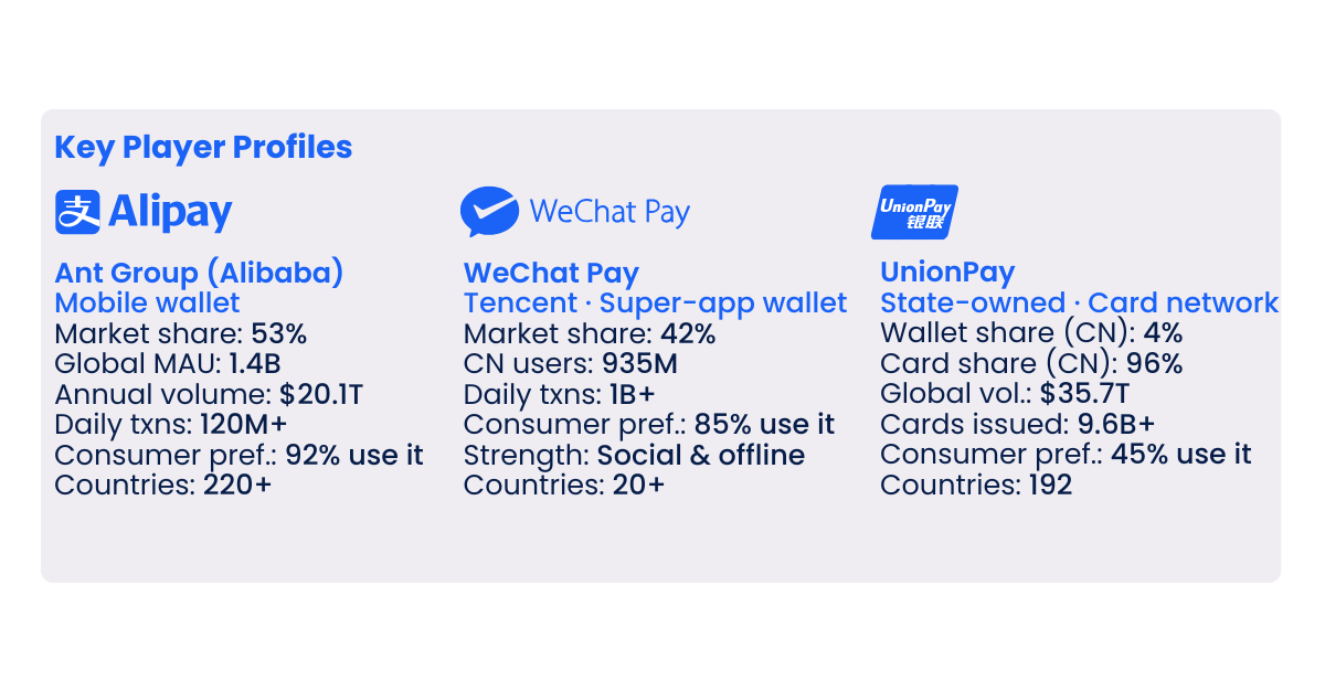 Together, these three platforms represent the near-total landscape of Chinese consumer payment infrastructure. No serious cross-border payment strategy targeting Chinese consumers — whether for payment acceptance or payout disbursement — can afford to treat any one of them as optional.